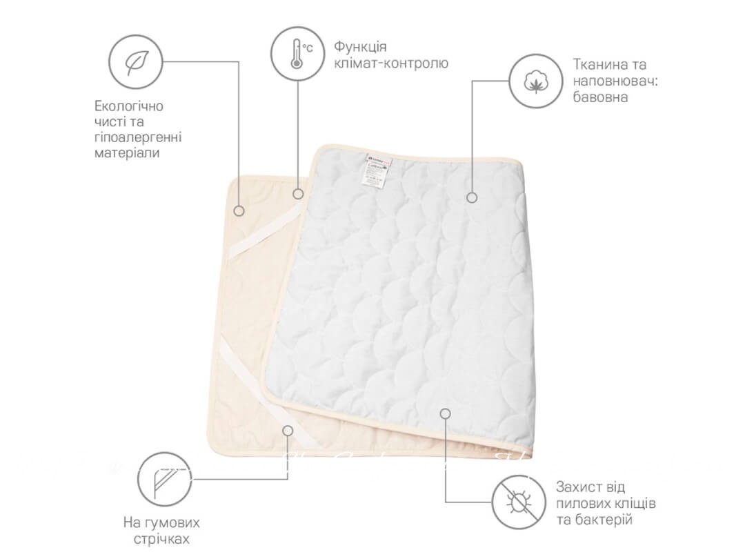 Размер70х140, 60х120ЦветВнимание! Цвет и оттенок на фото может отличаться от реального товара, в зависимости от настроек вашего монитора (яркость, контраст, насыщенность), а также освещения в помещении.БежевыйСпособ крепленияНа резинках по угламМатериалхлопокНаполнительхлопокСтранаУкраина